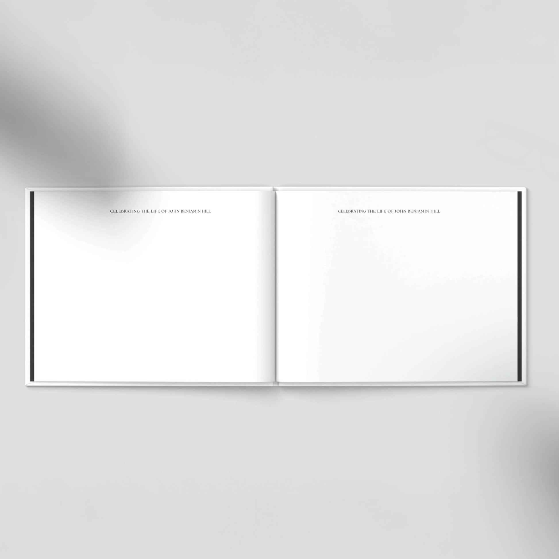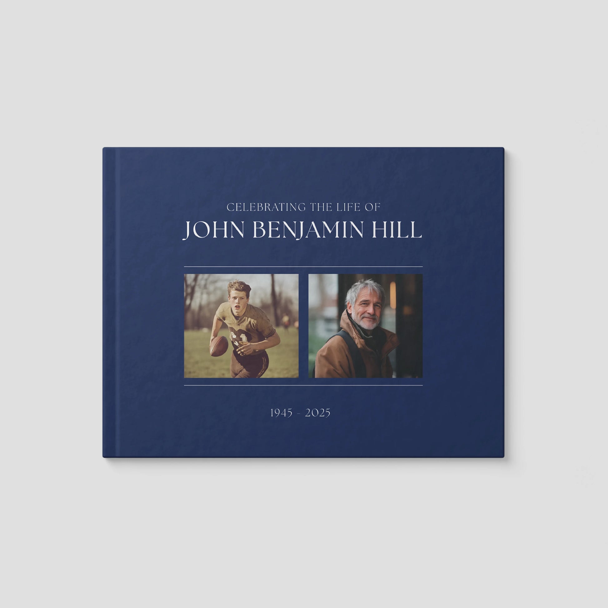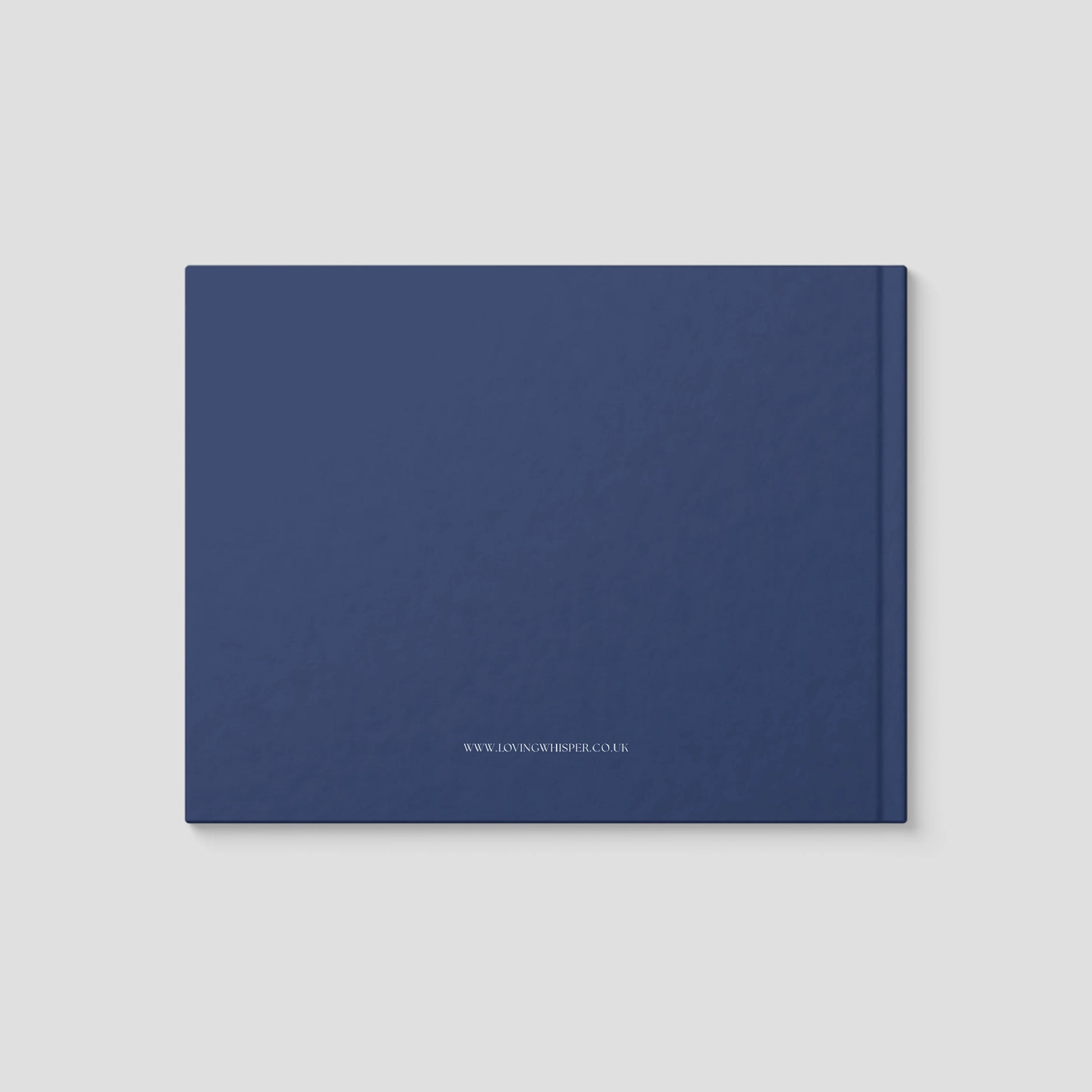 A dignified and timeless condolence book, designed with a deep navy cover and personalised in a classic serif font for a refined, masculine touch. The beautifully bound guestbook opens with two cherished photos of your loved one, framed by symbolic sunrise and sunset dates to mark a life well lived. Perfect for funerals, memorials, or celebration of life services, it provides space for friends and family to share heartfelt messages and memories — a thoughtful keepsake to honour and remember.