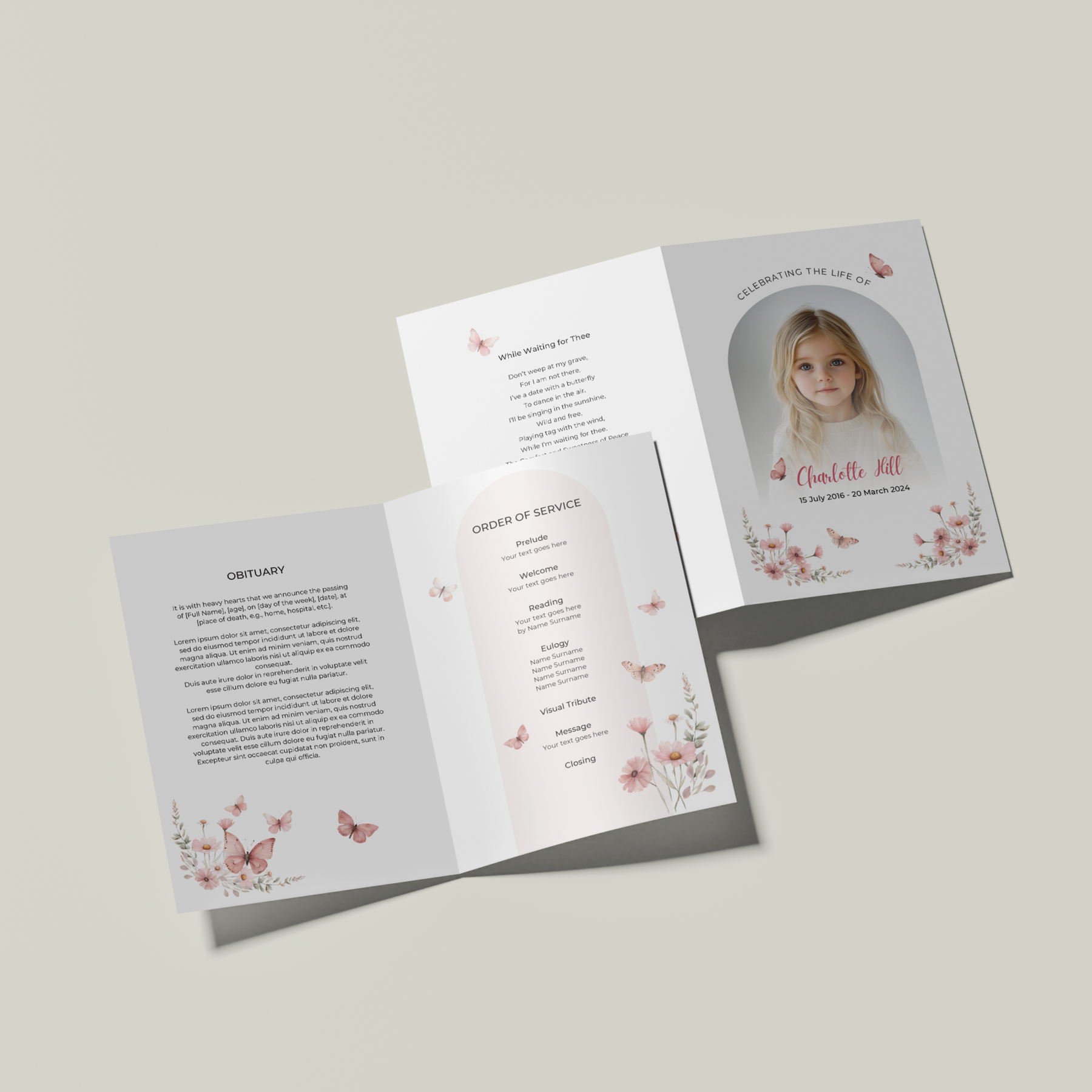 An A5 Memorial Order of Service is a beautifully designed, folded brochure that guides attendees through a funeral or memorial service. This keepsake typically includes a cover with a photo and name of the deceased, a schedule of the service, hymns, prayers, readings, and heartfelt tributes. The one-fold design creates four pages, offering a compact yet elegant way to honour and remember a loved one.