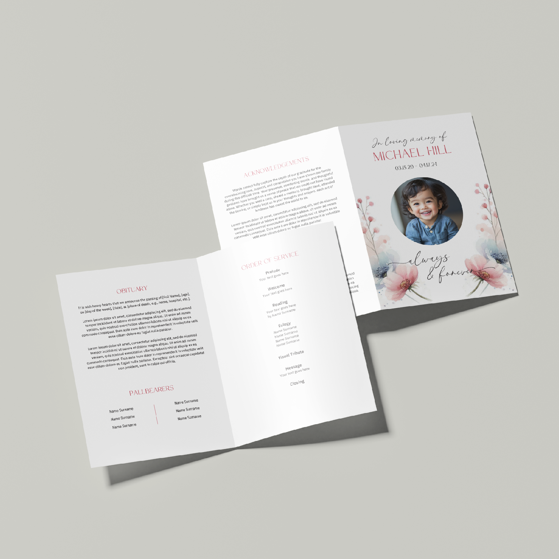 An A5 Memorial Order of Service is a beautifully designed, folded brochure that guides attendees through a funeral or memorial service. This keepsake typically includes a cover with a photo and name of the deceased, a schedule of the service, hymns, prayers, readings, and heartfelt tributes. The one-fold design creates four pages, offering a compact yet elegant way to honour and remember a loved one.