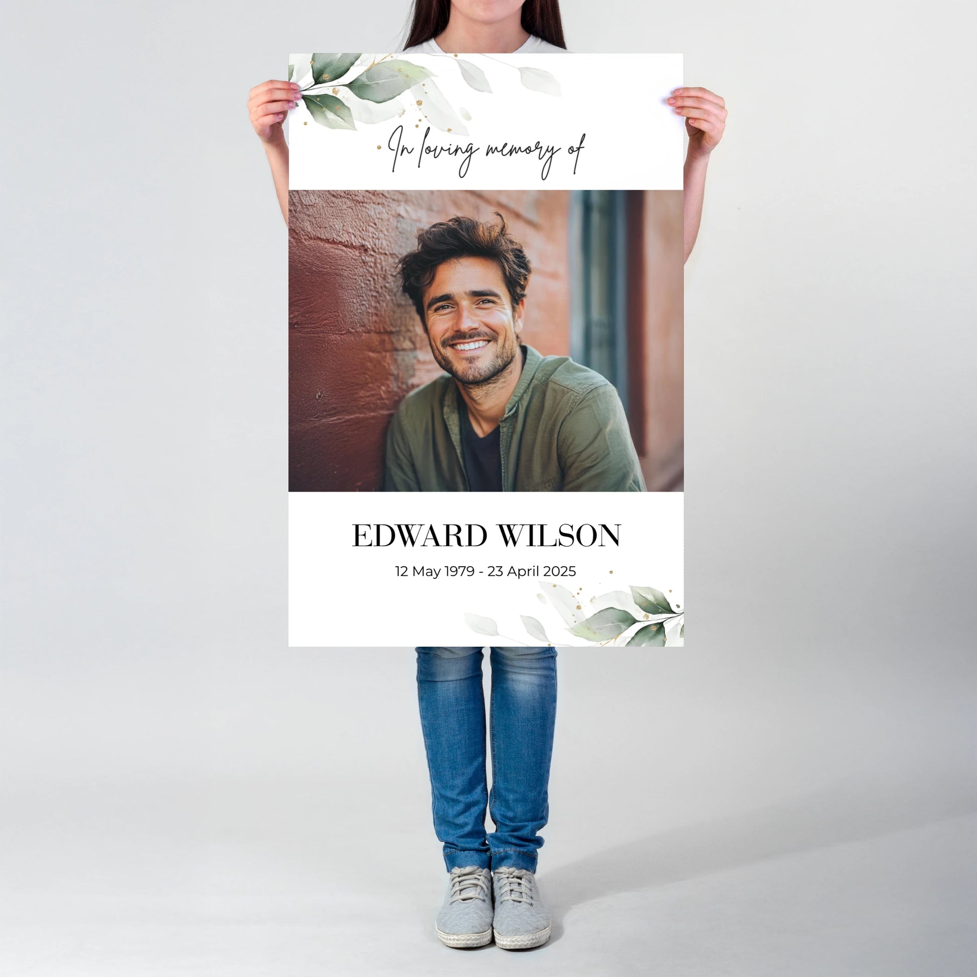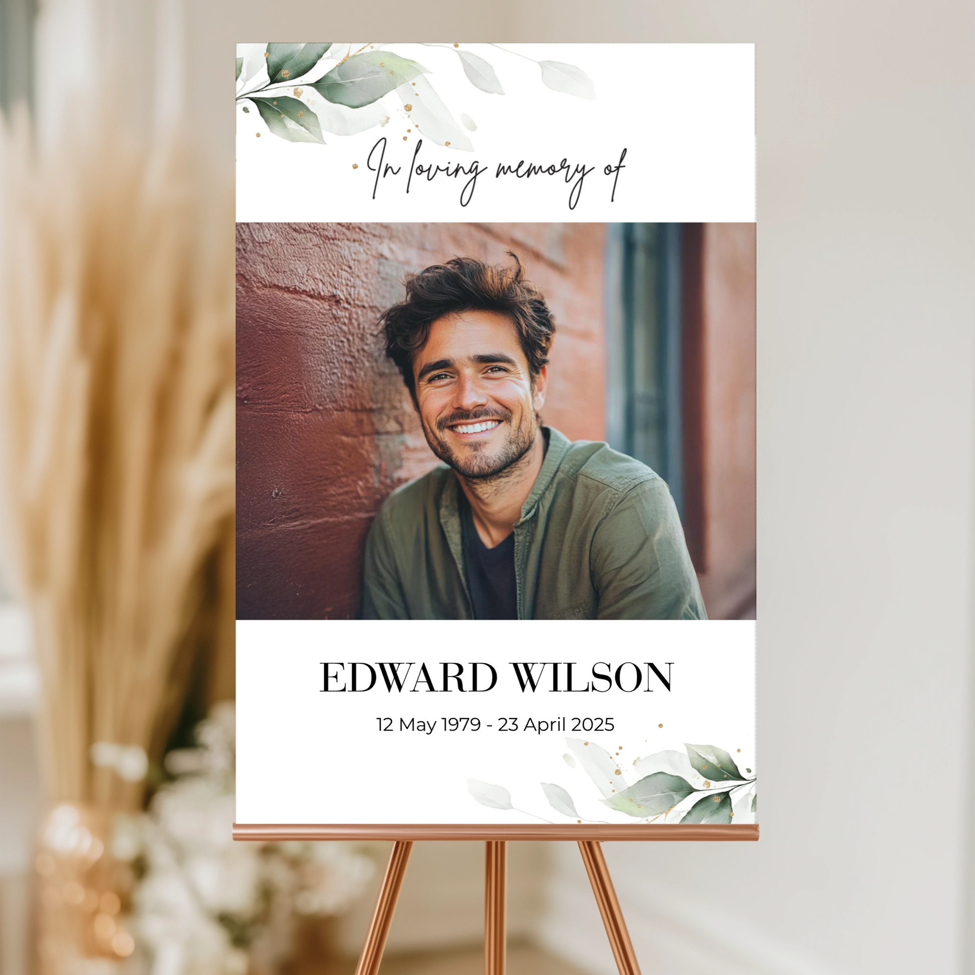 Create a peaceful and elegant tribute with this personalised memorial sign, featuring a cherished photo, soft eucalyptus watercolour accents, and refined typography. Perfect for funerals, memorials, and celebrations of life, it symbolises renewal, strength, and eternal love.